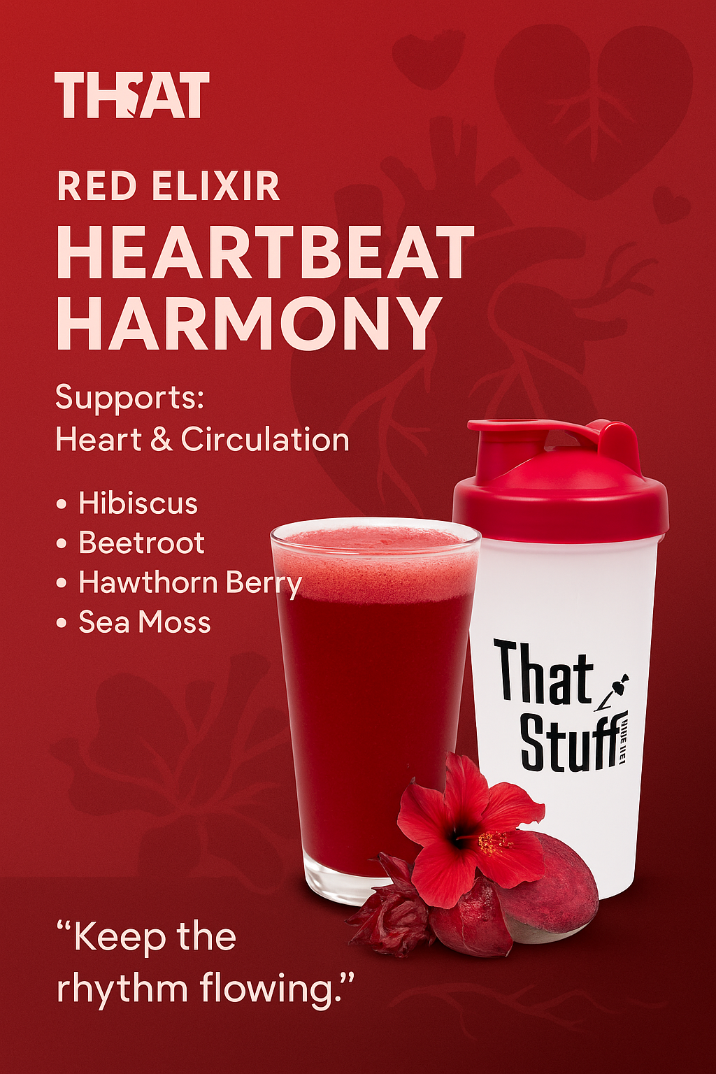 - Red – Heart & Circulation (with hibiscus, beetroot, hawthorn berry, sea moss)