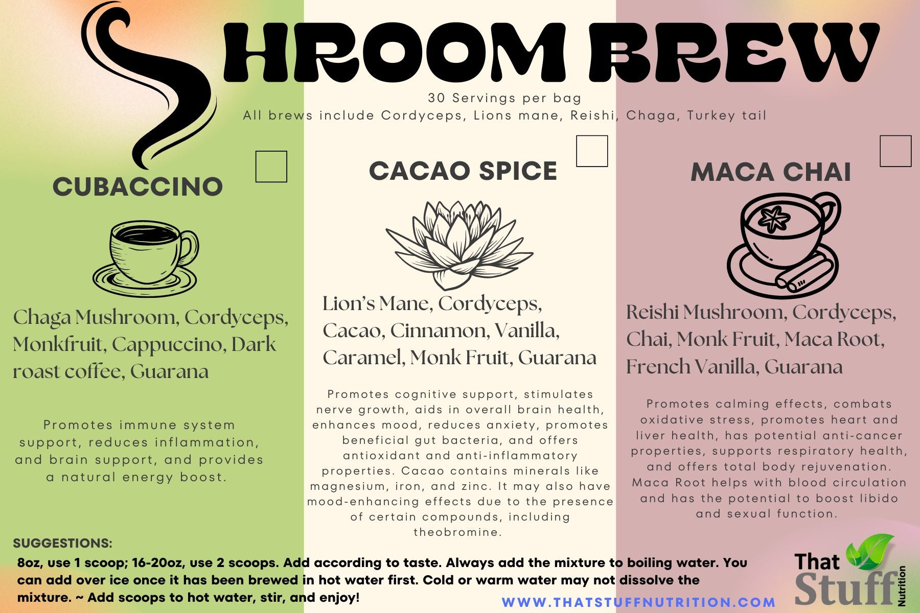 Delve into the rich world of fungi with That Stuff Nutrition's shroom brews, expertly formulated with a diverse array of seven potent mushrooms. Experience the immune-boosting prowess of Reishi, the cognitive enhancement of Lion's Mane, and the adaptogenic benefits of Chaga. Our blends also feature the stamina-boosting Cordyceps, antioxidant-rich Turkey Tail, mood-enhancing Shiitake, and the nutrient-packed Maitake. Each mushroom plays a unique role, contributing to a holistic approach to well-being in every sip of That Stuff Nutrition's shroom brews.